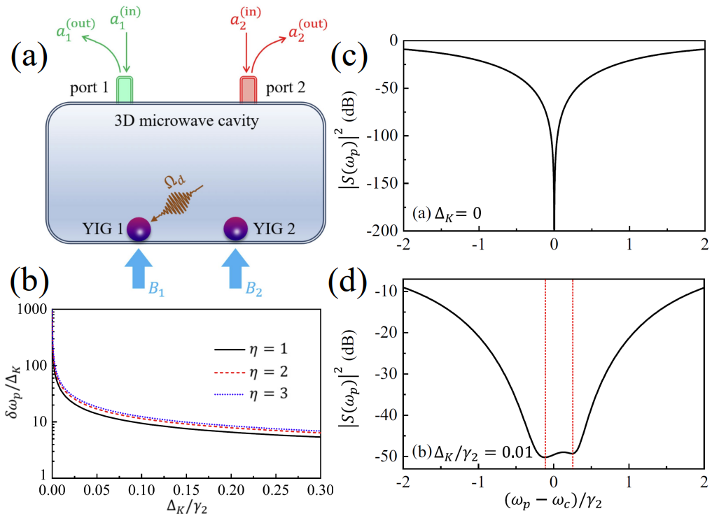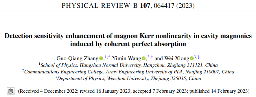 近日,如意直播 教师张国强博士和中国人民解放军陆军工程大学王艺敏博士、温州大学熊伟副教授合作,在物理领域著名学术期刊Physical Review B上发表了题为“Detection sensitivity enhancement of magnon Kerr nonlinearity in cavity magnonics induced by coherent perfect absorption”的研究论文。论文最重要的研究成果是利用相干完美吸收增强了磁振子克尔非线性(MKN)的探测灵敏度。