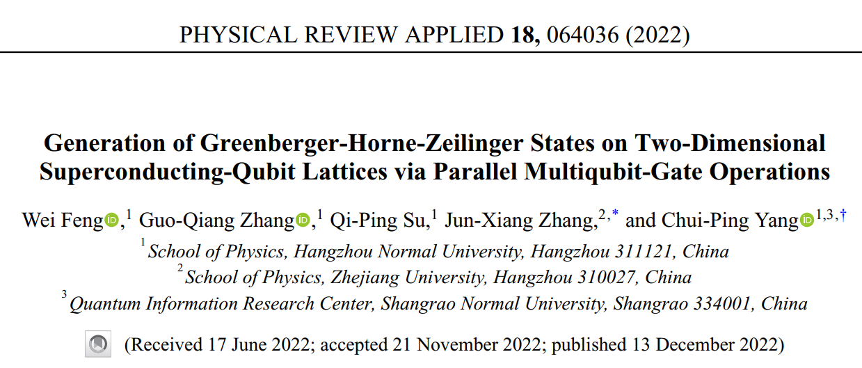 近日,如意直播 冯伟博士及合作者在应用物理领域重要学术期刊上发表题为“Generation of Greenberger-Horne-ZeilingerStatesonTwo-Dimensional Superconducting-Qubit Lattices via Parallel Multiqubit-Gate Operations”的研究论文。论文的重要研究成果是在最近被Google等广泛采用的二维超导量子计算芯片上实现GHZ量子纠缠态的制备。