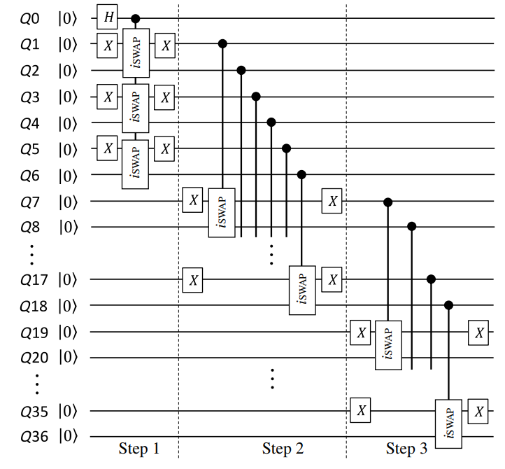 本研究工作中,我们提出了一种新的机制,可以在先前报道的2D超导量子比特晶格上有效地生成GHZ纠缠态。该方法基于多量子比特受控iSWAP门,其可以通过有效的三体相互作用实现。另外,涉及的三体相互作用可以很容易地通过调节2D晶格上量子比特之间的适当失谐和耦合强度来合成。根据我们的方案,在深度为3的量子线路内,我们可以获得 37 量子比特GHZ 纠缠态。我们还基于晶格的原始哈密顿量对制备过程进行了数值模拟。采用实验上真实量子芯片的实际参数,37量子比特GHZ态的保真度大于0.5,这证实了我们的方法在现有的二维超导量子比特晶格处理器上是可行的。