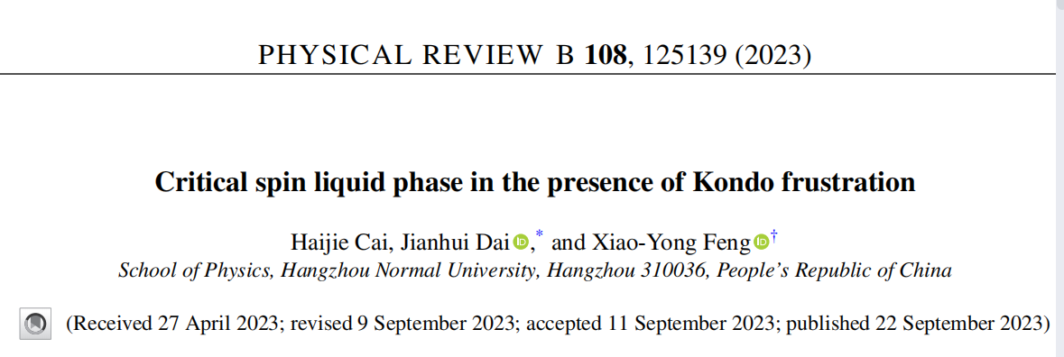 如意直播 硕士研究生蔡海杰及合作者在凝聚态物理著名期刊Physical Review B上发表题为“Critical spin liquid phase in the presence of Kondo frustration”的研究论文