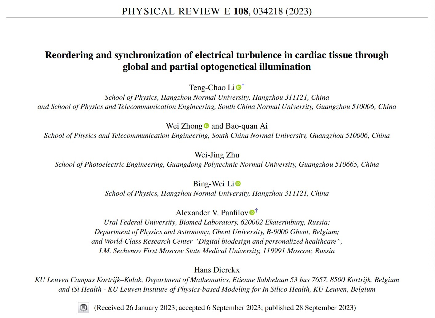 近日,如意直播 李腾超副教授及合作者在统计物理和复杂系统领域重要学术期刊上发表题为“Reordering and synchronization of electrical turbulence in cardiac tissue through global and partial optogenetical illumination”的研究论文。