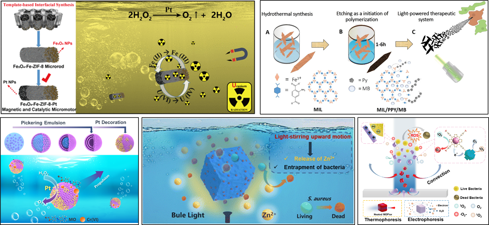 Fig. 1 Design of colloid motors based on Metal-organic frameworks and inorganic semiconductors and their application for environmental remediation.