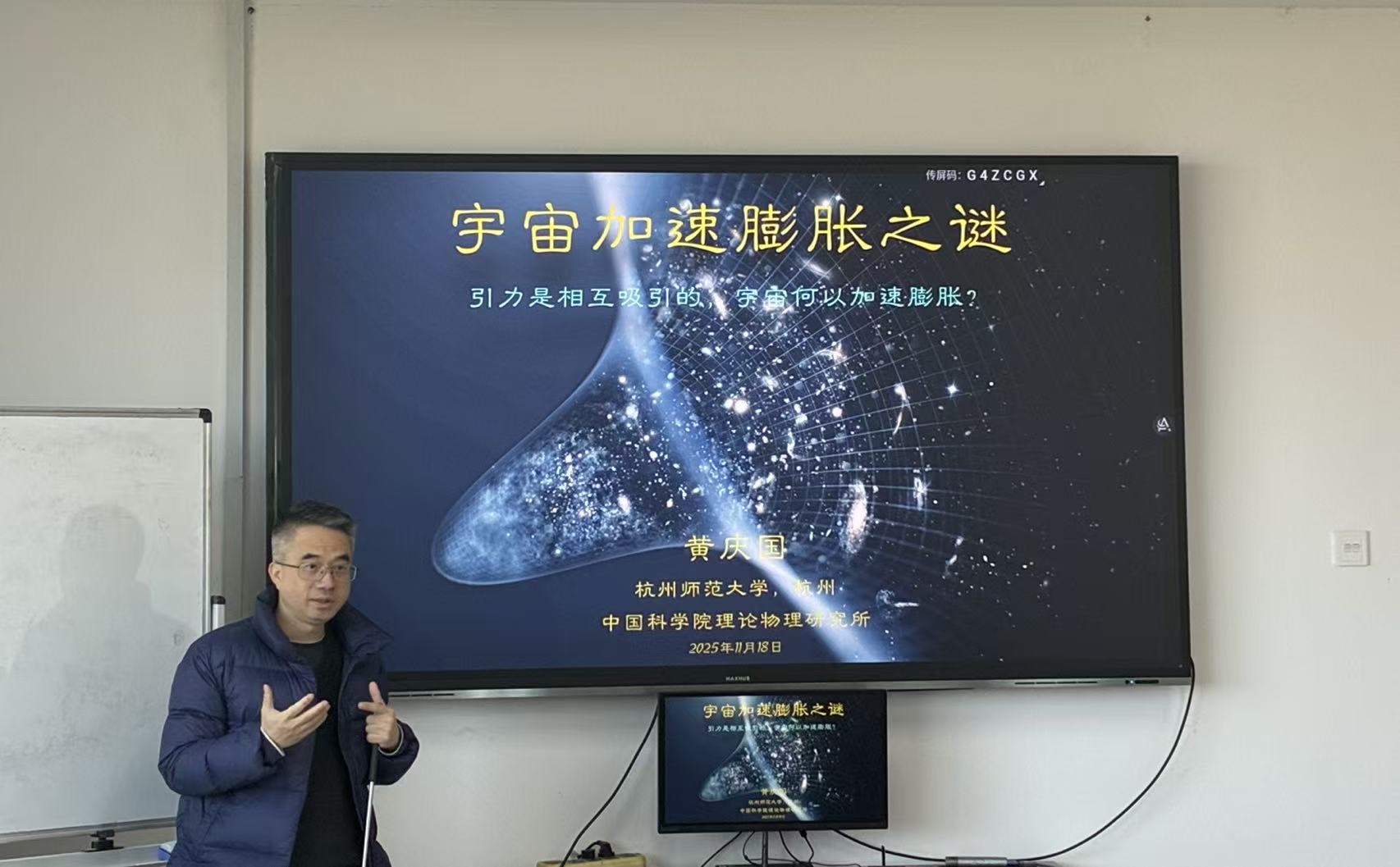 近日,中国科学院理论物理研究所黄庆国研究员应邀来访如意直播 ,并作了题为“宇宙加速膨胀之谜”的专题学术报告,相关领域教师及研究生积极参与交流。