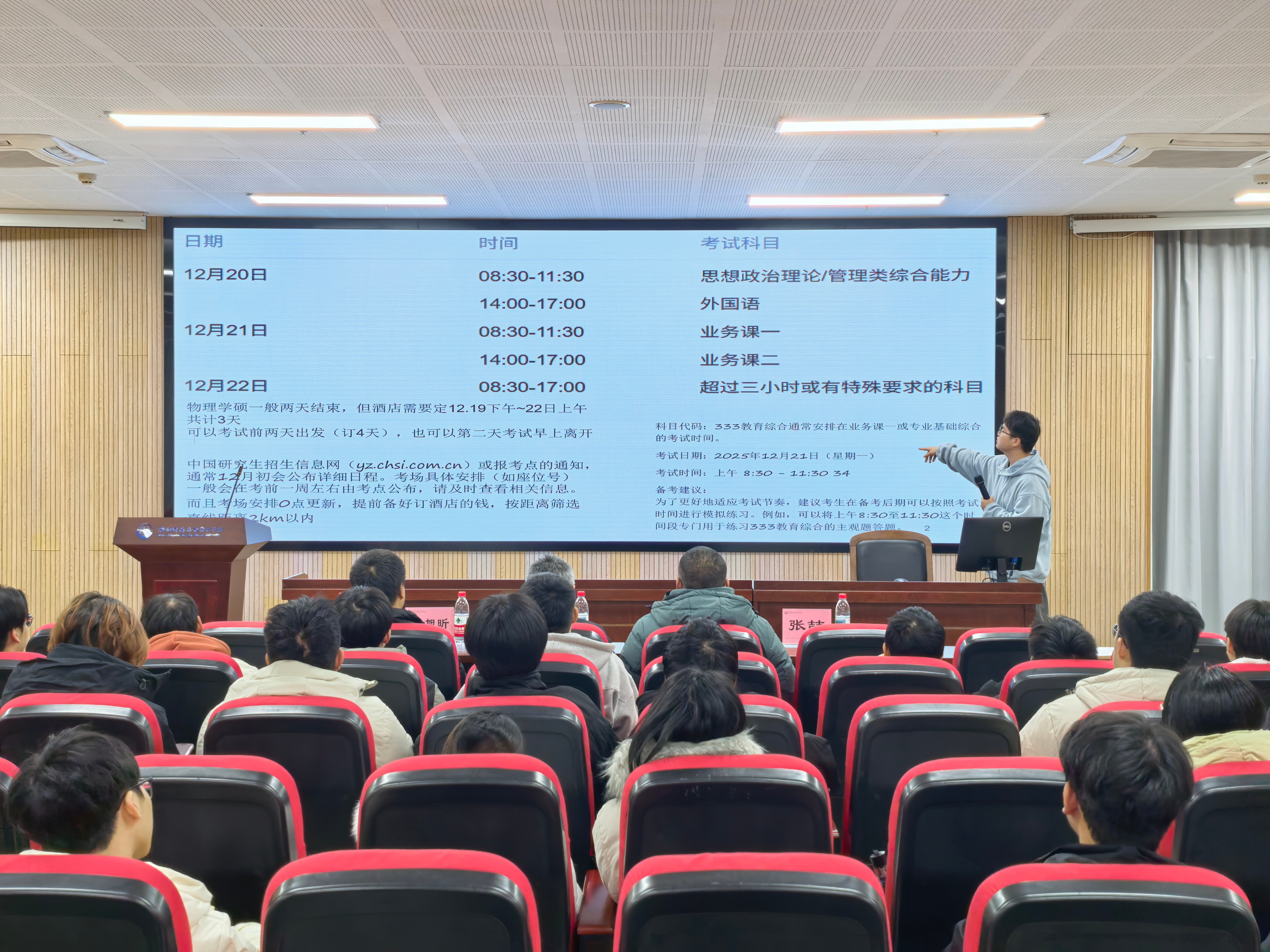 随后,朱鹏晖学长结合自己的备考实践,详细讲解了考试注意事项,鼓励2022级的学弟学妹们坚持到底,一战成硕!