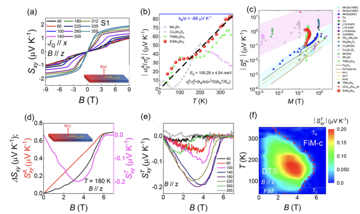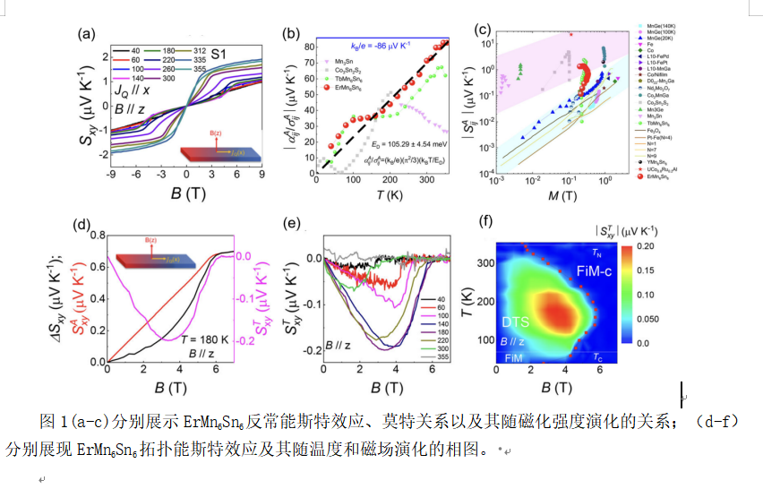 图1(a-c)分别展示ErMn6Sn6反常能斯特效应、莫特关系以及其随磁化强度演化的关系;(d-f)分别展现ErMn6Sn6拓扑能斯特效应及其随温度和磁场演化的相图。