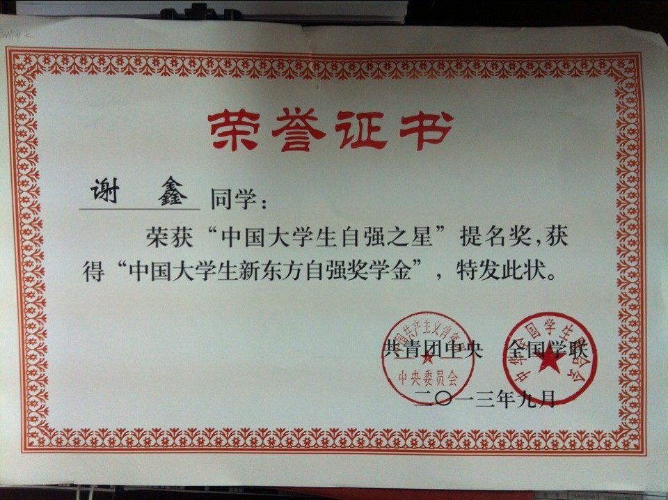 谢鑫同学荣获“中国大学生自强之星”提名奖,并获“中国大学生新东方自强奖学金”,成为我校2013年唯一获得该项荣誉提名的同学。