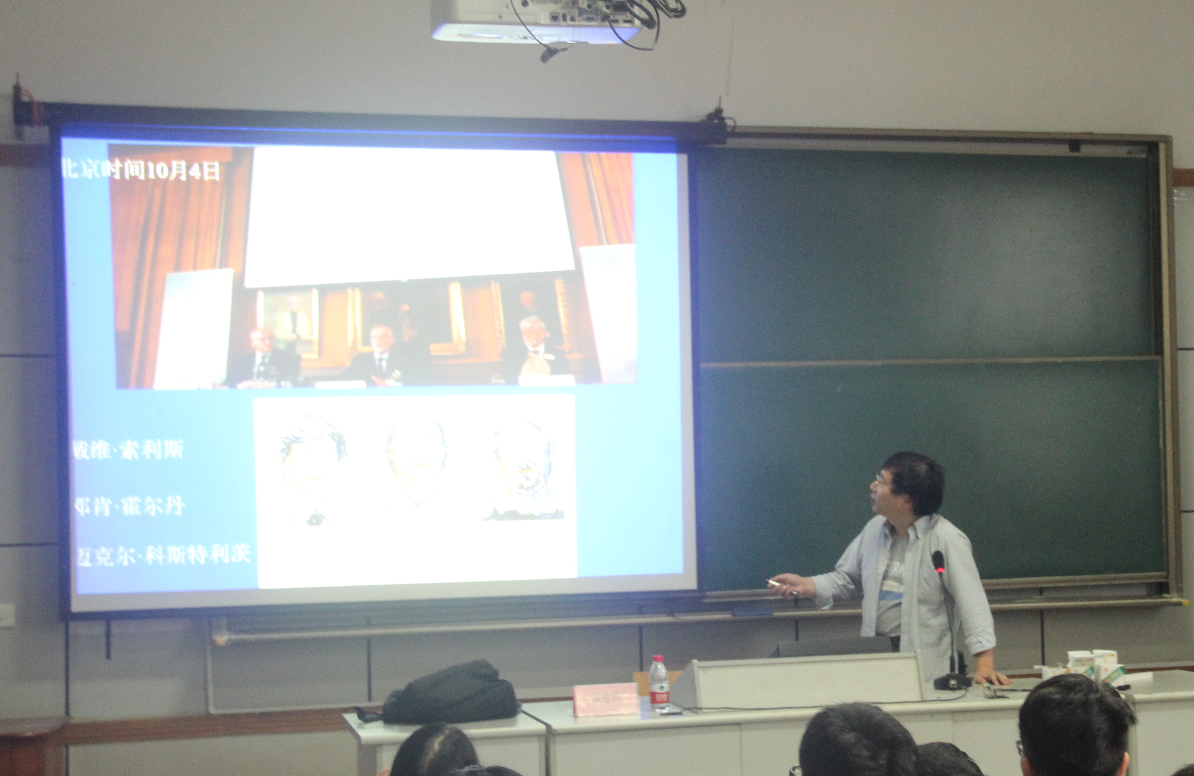 10月12日,理学院“拓扑物质,数理交融——2016年诺贝尔物理学奖解读”讲座在C-102教室顺利举行,主讲人为理学院物理系教授戴建辉老师。