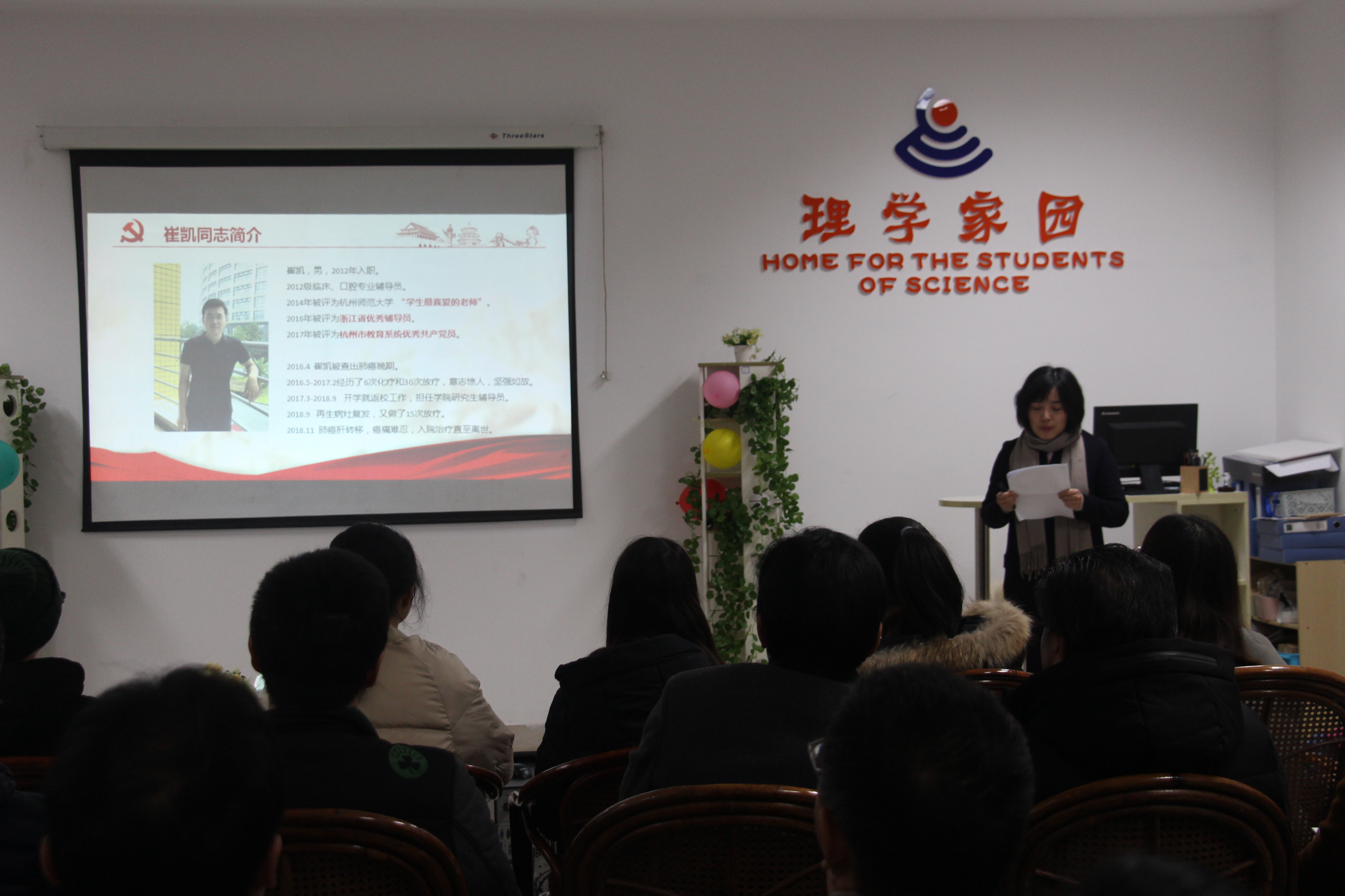 会上,朱晓兰介绍了崔凯在学生思想教育工作中的突出表现,走访寝室、与学生谈心谈话、和同学打球运动,在生活、学习中无微不至地关怀学生、关爱学生,曾被票选为学校最受喜爱的老师。在与病魔斗争的日子里,崔凯依然坚守岗位,勤勤恳恳、任劳任怨,参加学生实习动员会、带研究生参与素质拓展活动、为学生上就业指导课,甚至在最繁忙的九月开学季也强忍病痛,坚持工作。