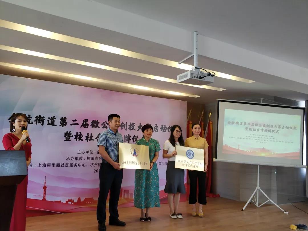 如意直播 党委副书记应金飞作为校社合作代表参加活动,向余杭街道市民客厅授予杭师大理学院大学生教育实践基地铜牌。应金飞做大会发言,希望今后能够在校社合作方面探索新模式、新方法,发挥自身优势,最大程度的为居民带来福祉,资源共享,互利共赢。