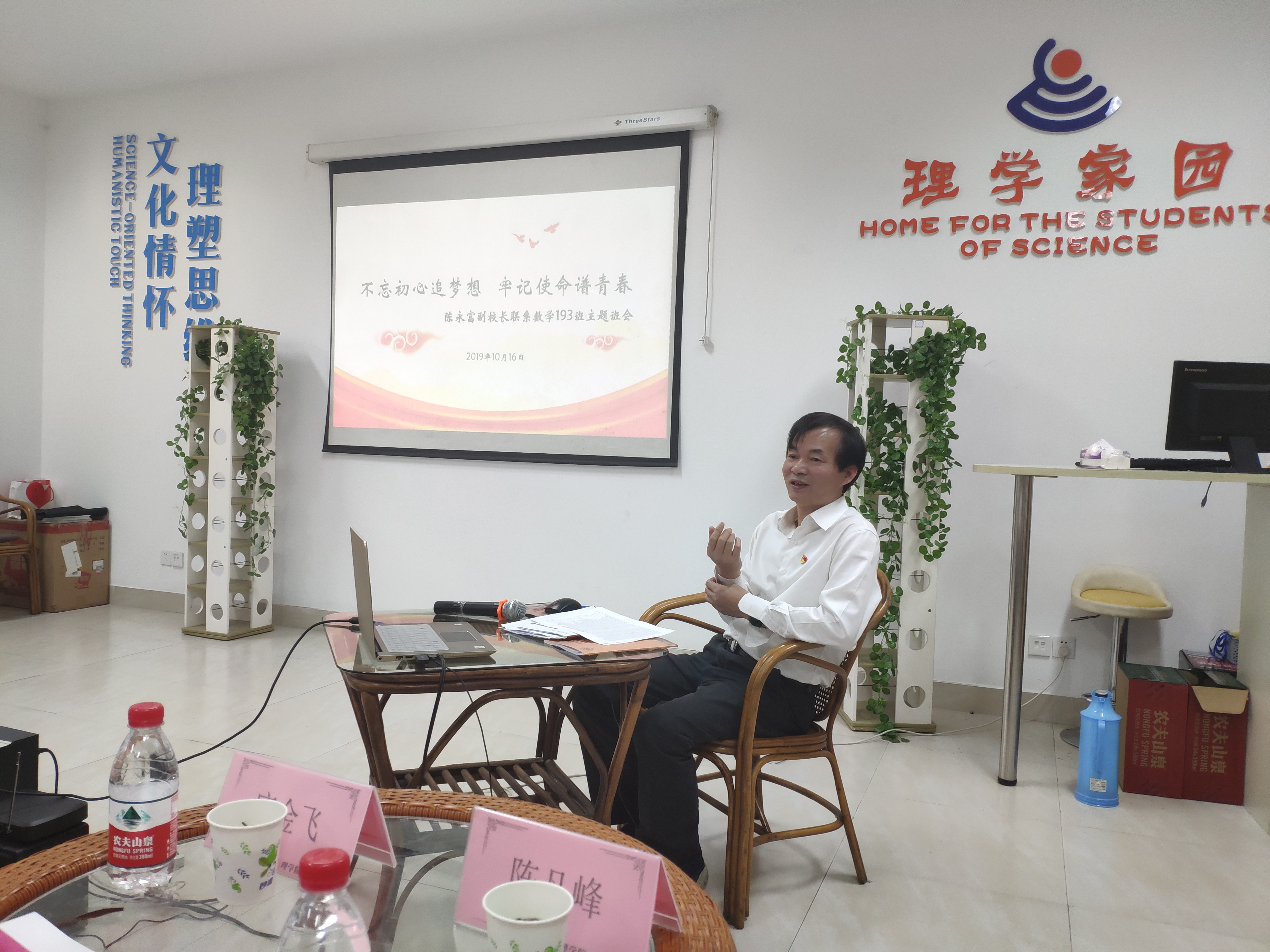 10月16日下午,如意直播 在理学家园举行了“不忘初心追梦想,牢记使命谱青春”的主题班会,陈永富副校长、研工部部长金向华老师、学院党委书记王淑君老师、副书记应金飞老师、数学193班班主任孙庆有老师、学院辅导员陈凡峰老师及数学193班全体学生参加了本次主题班会。