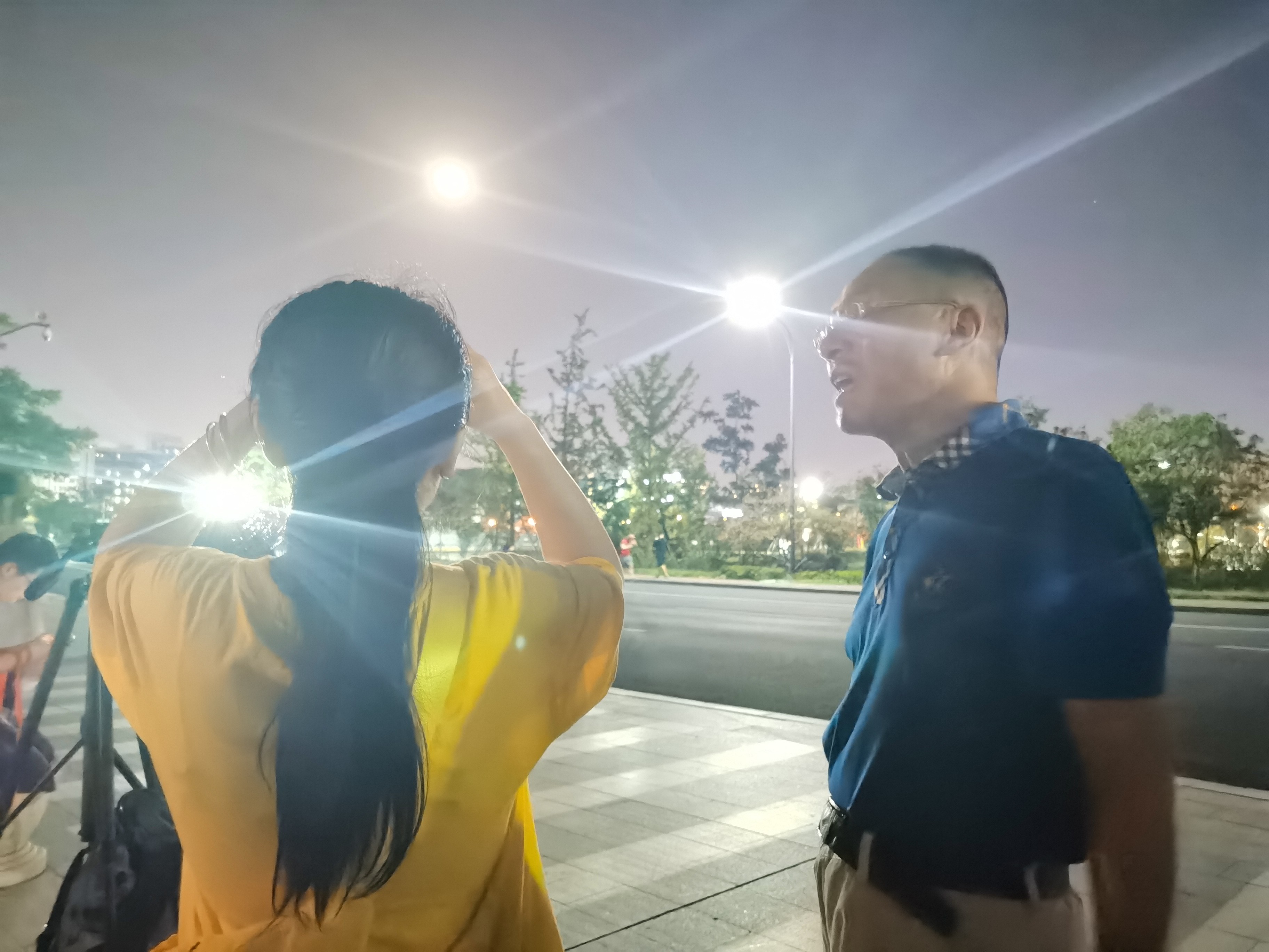 为了提升活动的专业性和趣味性,如意直播 教工第一党支部的陈久和老师带来了两只天文望远镜,并亲自担任活动的讲解员,将他的《地球和宇宙》课程讲坛从教室搬到了广场上。