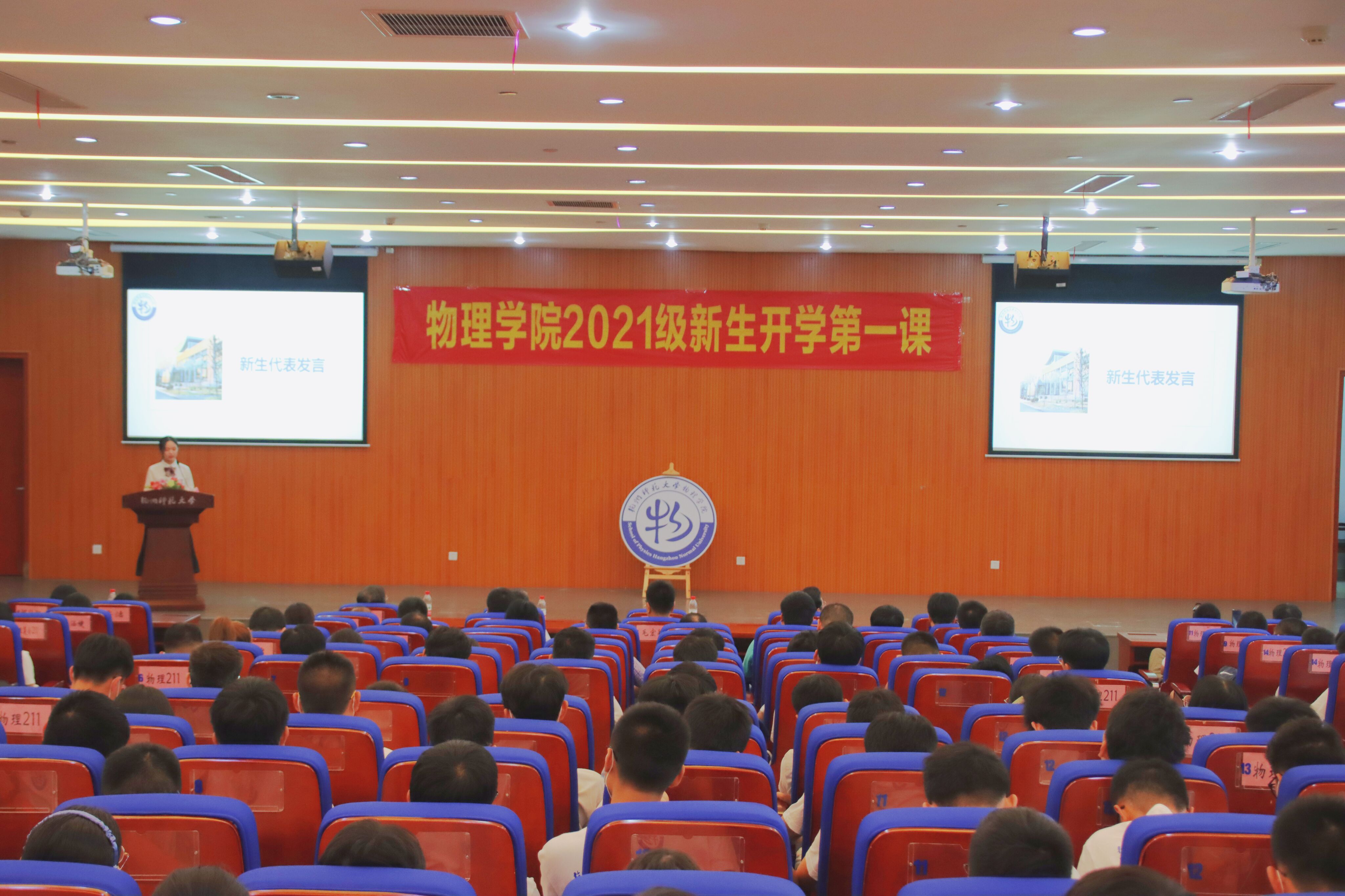 学院学科负责人、教师代表戴建辉教授对新生提出了三点希望:一是希望不仅仅在教室、食堂能看到同学们的身影,还希望能在操场、图书馆、实验室、办公室能经常看到同学们的身影,二是希望同学们能把自己的梦想和物理学、学校、国家的发展联系起来,三是希望同学们能够学有所成,未来在同学们之中出现一位物理学大师。