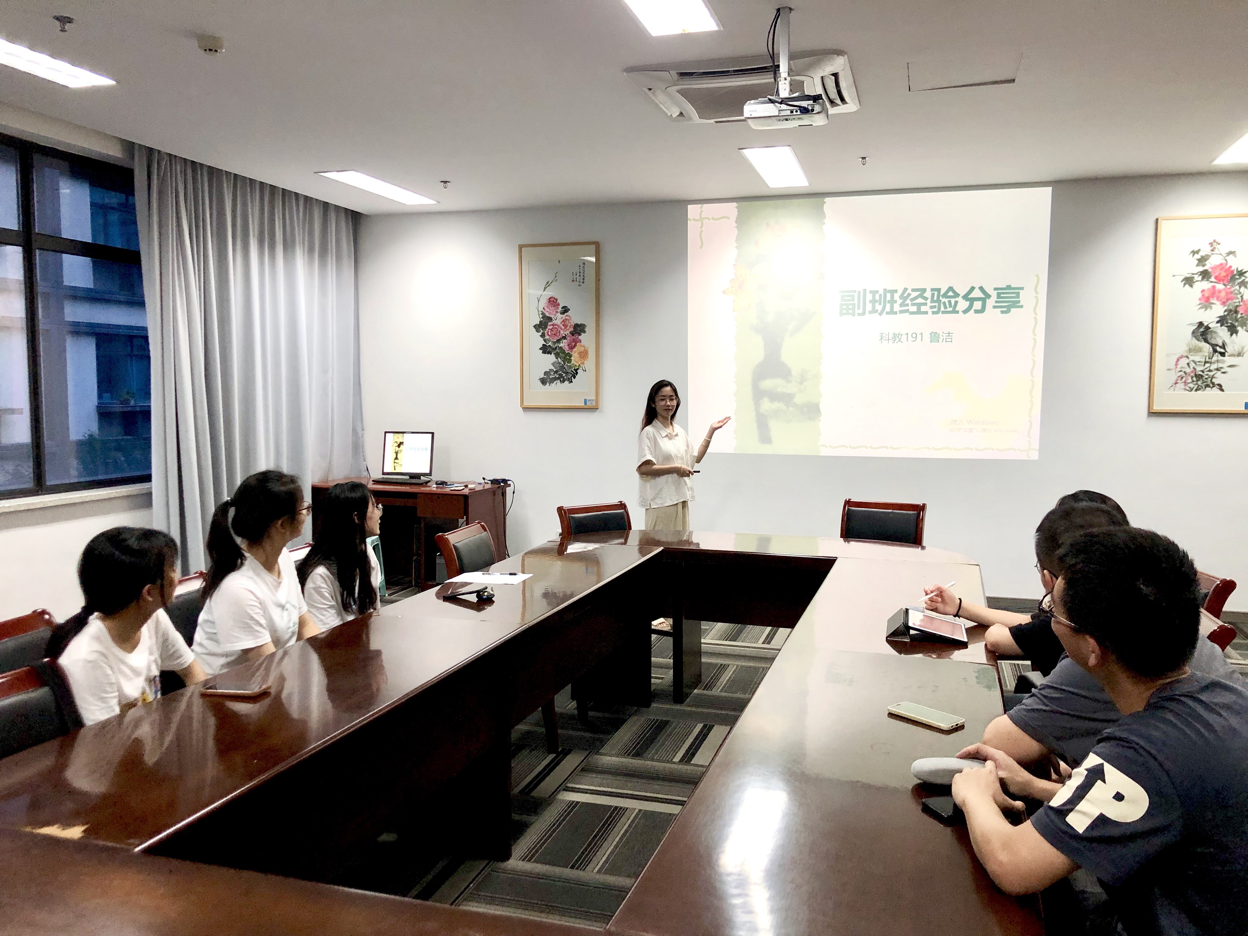 会议开始,鲁洁学姐根据一年来副班经历分享经验,以开学前、开学初、学期中、学期末为时间轴,从新生的学习、生活、社会工作等方面展开,详细分享副班工作内容及注意事项,为新生副班的工作开展提供了具有可借鉴与实操性的工作思路与方法。