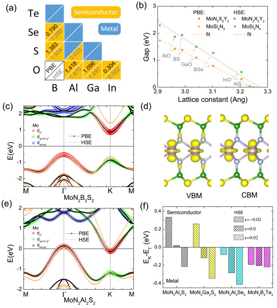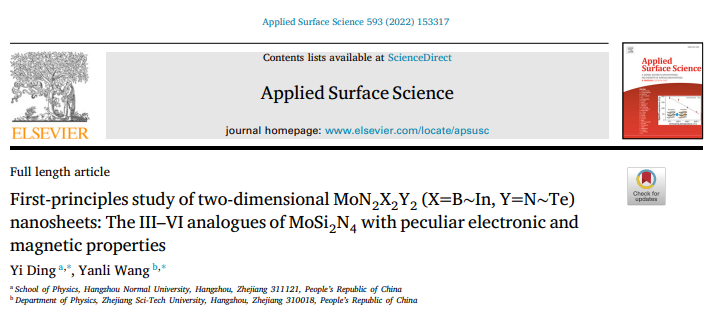 近日,如意直播 丁一团队在应用物理领域著名学术期刊Applied Surface Science上发表了题为“First-principles study of two-dimensional MoN2X2Y2 (X=B~In, Y=N~Te) nanosheets: The III-VI analogues of MoSi2N4 with peculiar electronic and magnetic properties”的研究论文。研究表明,作为新发现的三元MoSi2N4层状材料,存在更为广阔的表面元素自由度。通过对其三五族等电子体做分析,发现存在9种稳定的四元MoN2X2Y2结构。相应体系的带隙呈现出随结构晶格参数的线性变化关系,其会逐步转变为金属物性,并呈现有应力调节的金属-半导体转变、空穴诱发的磁性半金属行为。当和MoSi2N4构成空间异质结构后,不同的四元体系可以引发type-II、III型的能带对齐的特征。
