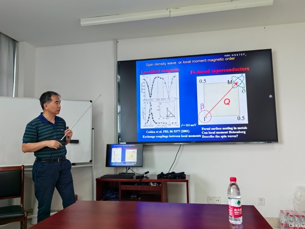 7月27日,美国莱斯大学、国际著名中子散射实验专家戴鹏程讲席教授莅临如意直播 开展题目为·“Competing itinerant and local spin interactions in kagome metal FeGe”的学术讲座。戴鹏程教授详细介绍并分享了他们最新的研究成果:利用非弹性中子散射探测FeGe材料中的新奇自旋激发谱,研究材料中CDW和canting温度的依赖关系[Nature 609, 490–495 (2022) ]。学术讲座吸引了来自浙江大学、西湖大学和我校凝聚态方向各位师生的极大兴趣,研究成果的前沿性和创新性也激发了大家热烈的讨论和探讨,并积极探索未来的合作方向和课题。