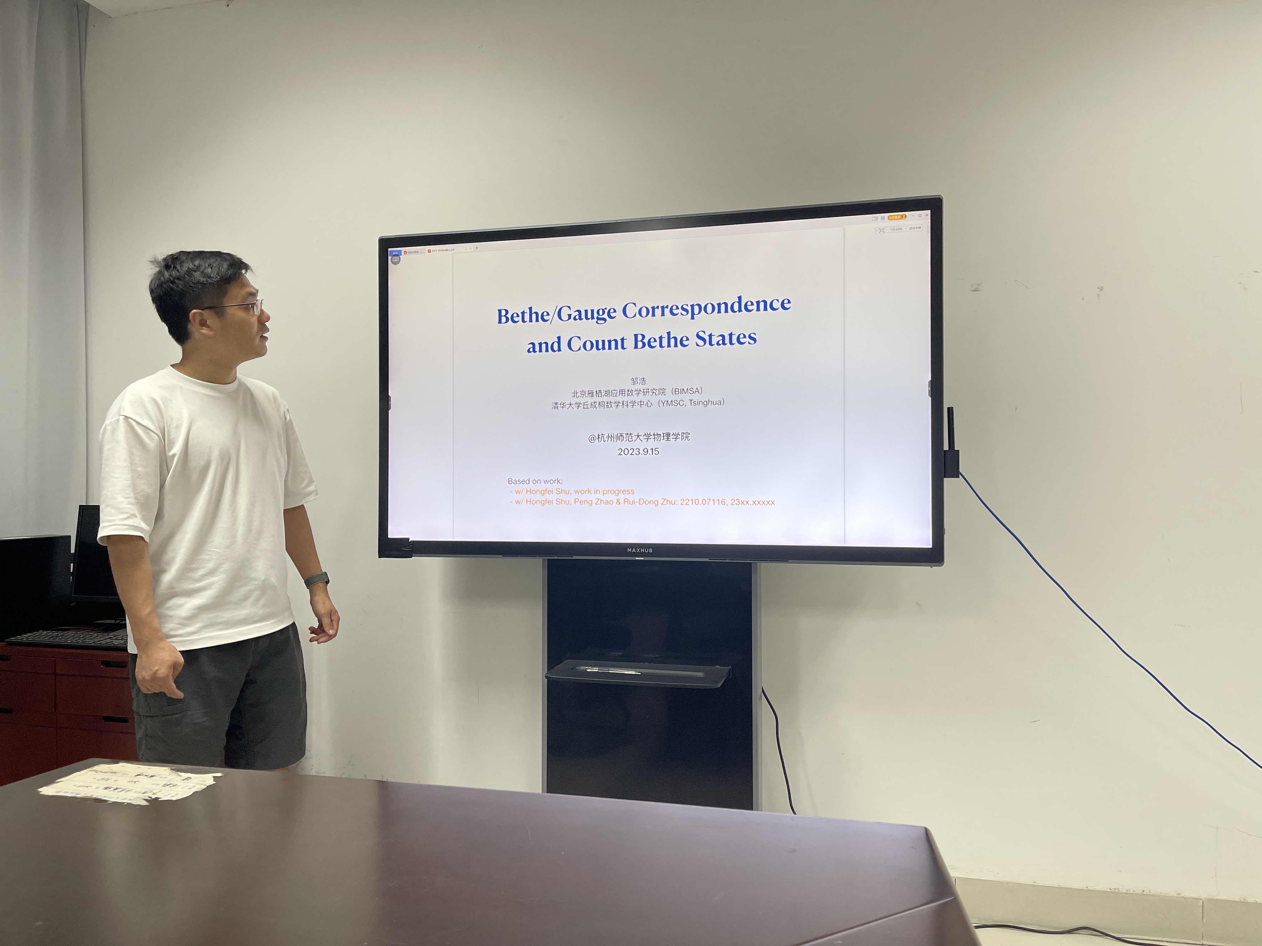 9月15日下午,北京雁栖湖应用数学研究院和清华大学丘成桐数学科学中心的邹浩士博士应邀来如意直播 ,为院内师生带来了一场精彩的学术报告。报告的题目是《Bethe/Gauge Correspondence and Count Bethe States》,主要介绍了可积系统里Bethe States的数态问题,Bethe/Gauge Correspondence的对应关系,以及如何把Bethe/Gauge Correspondence应用到超对称规范场论里解决数态问题。
