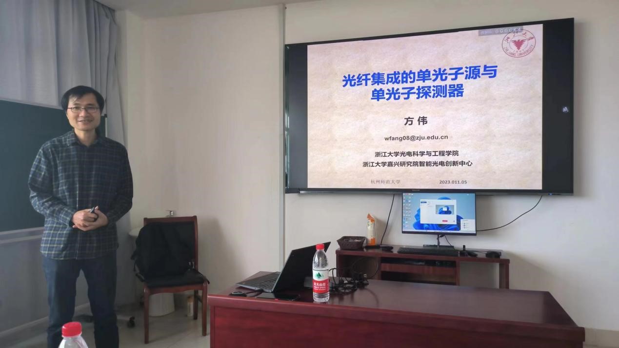 11月6日下午,学院邀请了浙江大学光电科学与工程学院方伟副教授做主题为“光纤集成的单光子源与单光子探测器”的报告。方教授主要研究方向包括微纳光纤的制备和应用,基于胶体量子点的单光子源、光学微腔与非线性光学等;在Nature Commun、PRL、JACS、Nano Lett.、Opt. Lett.等学术期刊上发表论文100余篇,SCI引用5000余次。
