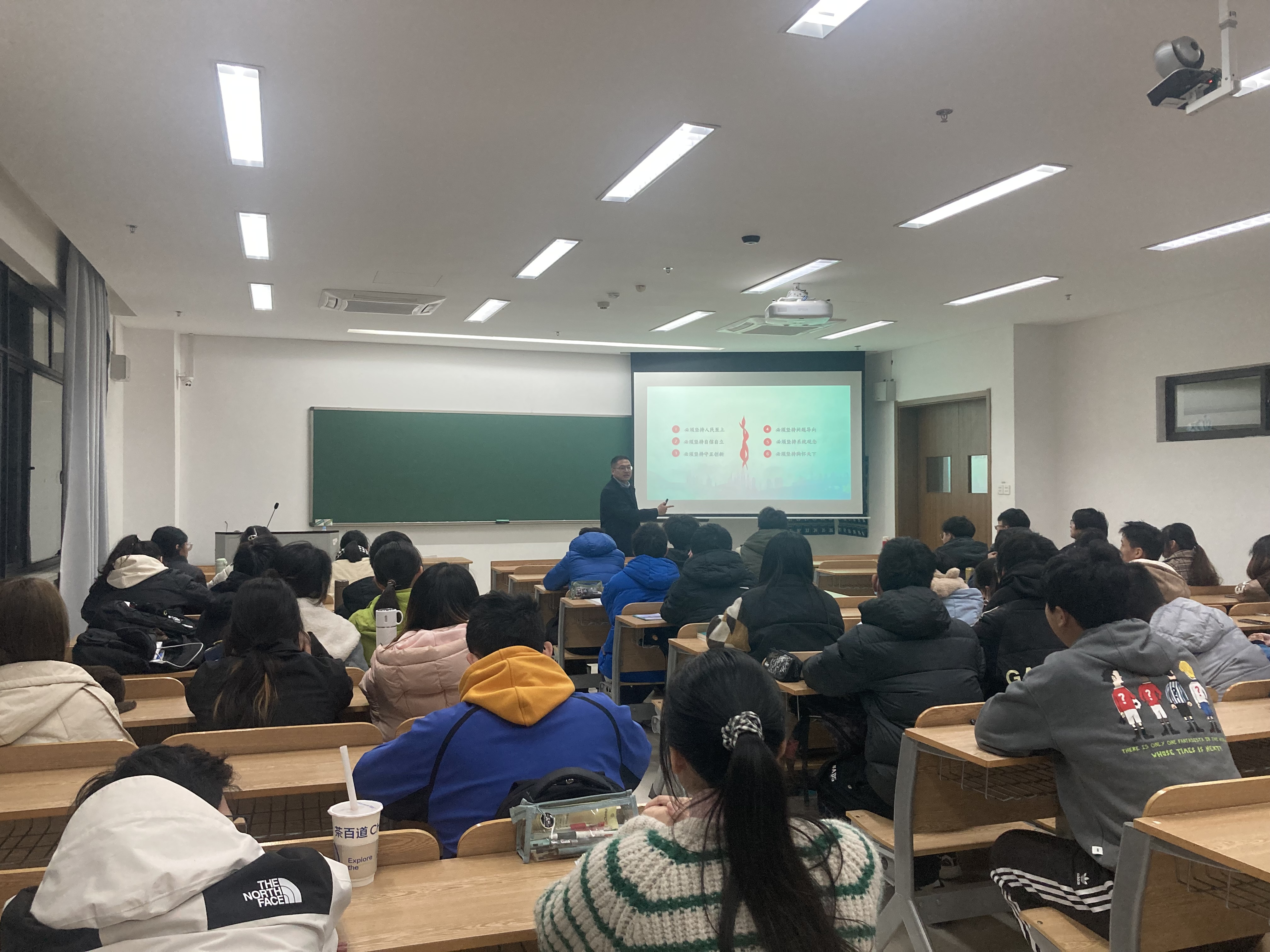 应维华教授围绕人民至上这个主题,从“百年未有之大格局、习近平新时代中国特色社会主义思想的主要内容、习近平新时代中国特色社会主义思想世界观和方法论”三个方面展开,向同学们讲述了中国目前处于的百年未有之变局,讲述了习近平新时代中国特色社会主义思想的精神内涵。从2001年的王伟撞机到2021年的孟晚舟回国,让同学们感受到了祖国的日渐强大;贫困地区在脱贫前后的交通对比图,让同学们感受到了扶贫工作取得的巨大成就。经过应老师的讲述,同学们对于“人民至上”这四个字有了更加深层的理解。