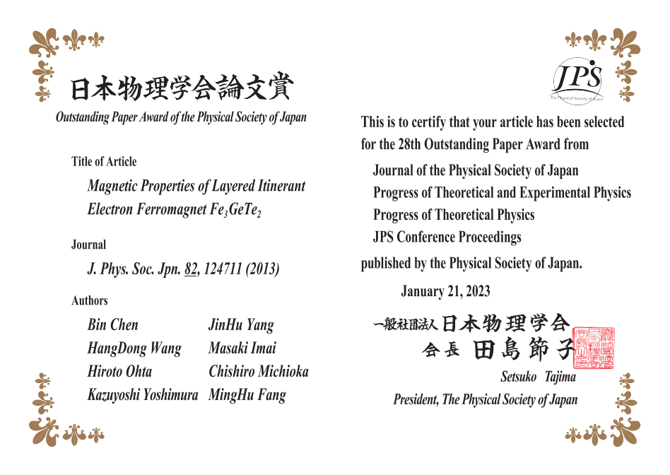 在最近结束的日本物理学会秋季会议中,如意直播 陈斌、杨金虎、王杭栋老师与浙江大学方明虎教授团队以及日本京都大学吉村一良教授团队共同发表的论文“Magnetic Properties of Layered Itinerant Electron Ferromagnet Fe3GeTe2”(J. Phys. Soc. Jpn. 82, 124711 (2013) 被引次数217)获得年度论文奖。