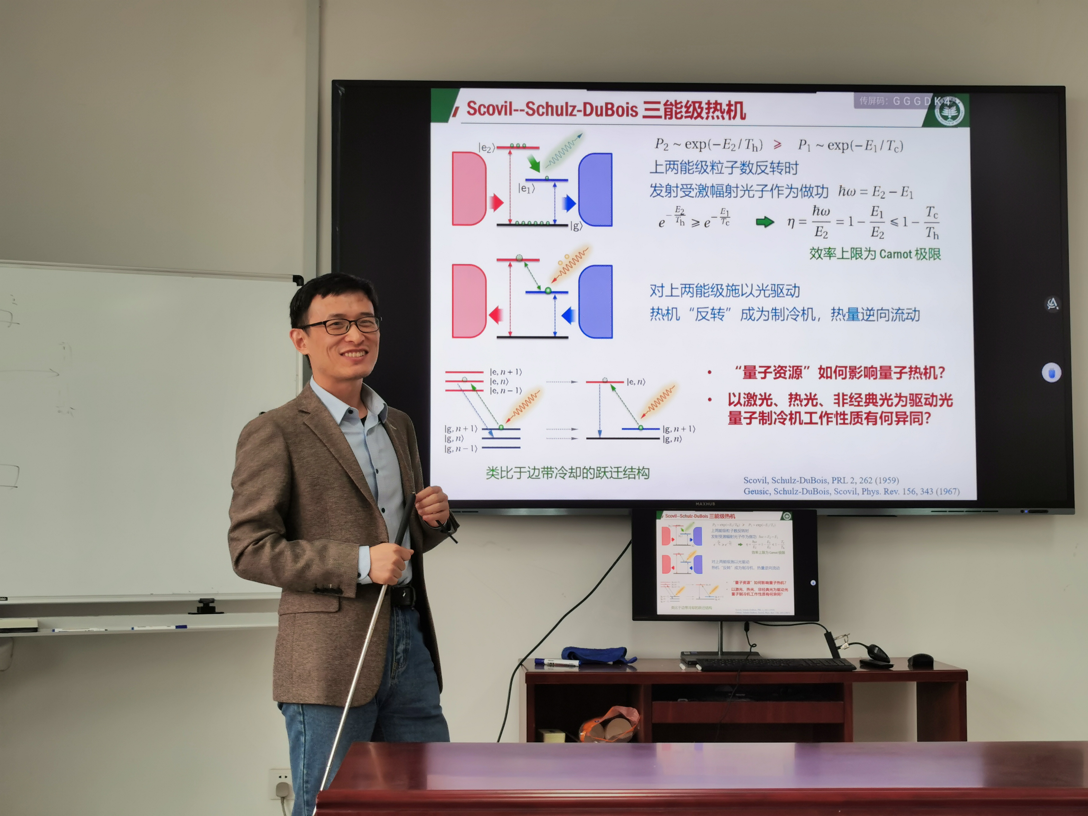 4月12日下午,北京理工大学李圣文副研究员应邀来如意直播 作题为“非经典光驱动的量子制冷机”的学术报告。非经典光在量子精密测量等领域有着广泛应用。报告中,李圣文研究员介绍了一个由多能级构成的量子制冷机,在驱动光作用下可驱使热量由低温热源流向高温热源。当分别以单模激光、热光、非经典反聚束光作为驱动光时,此量子制冷机产生的制冷功率在相同强度下,以激光作为驱动光时制冷功率最大。