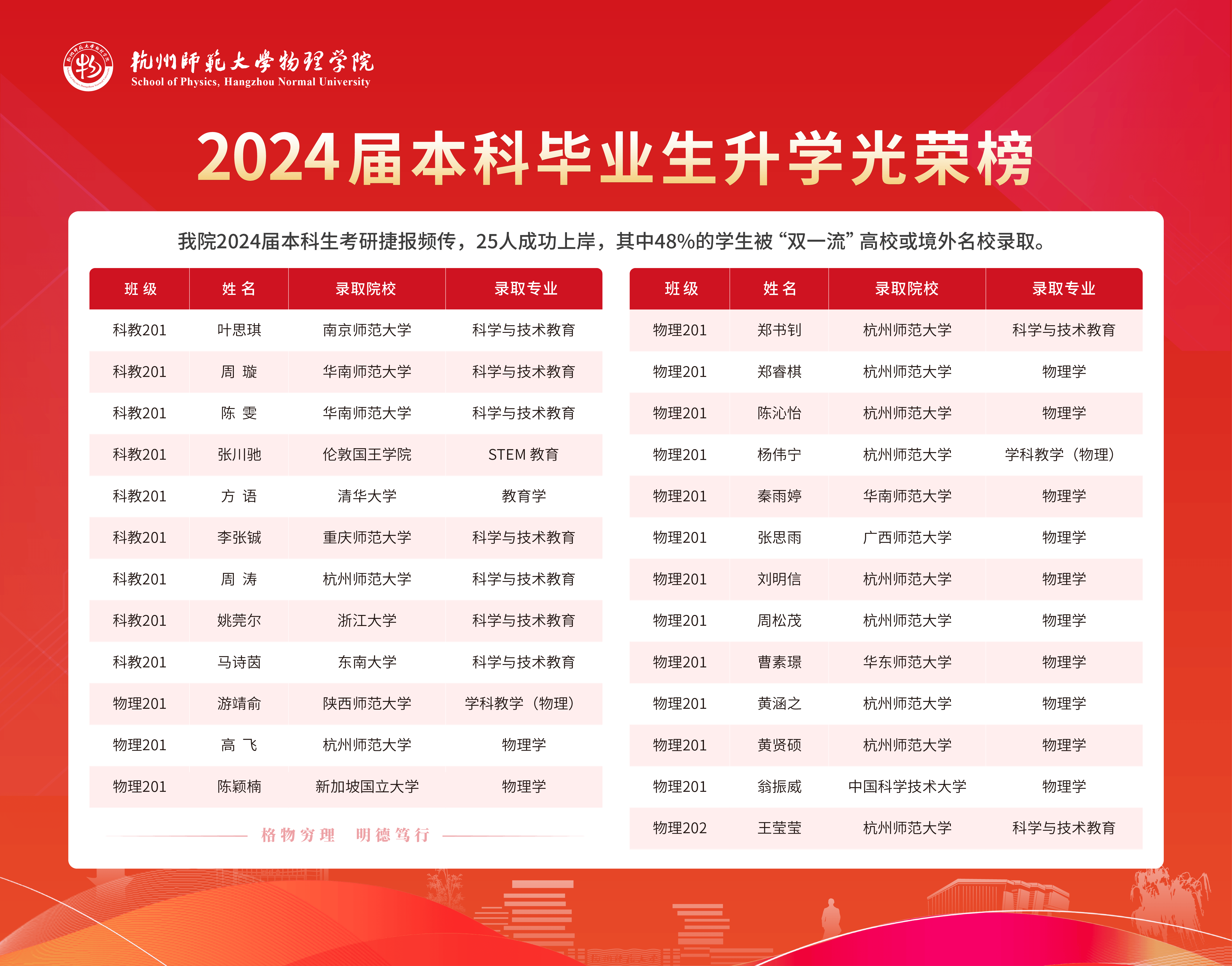 如意直播 2024届本科生考研捷报频传,25人成功上岸,其中48%的学生被“双一流”高校或境外名校录取。科教201方语同学在党员教师持续鼓励与指导下,成功考取清华大学研究生。