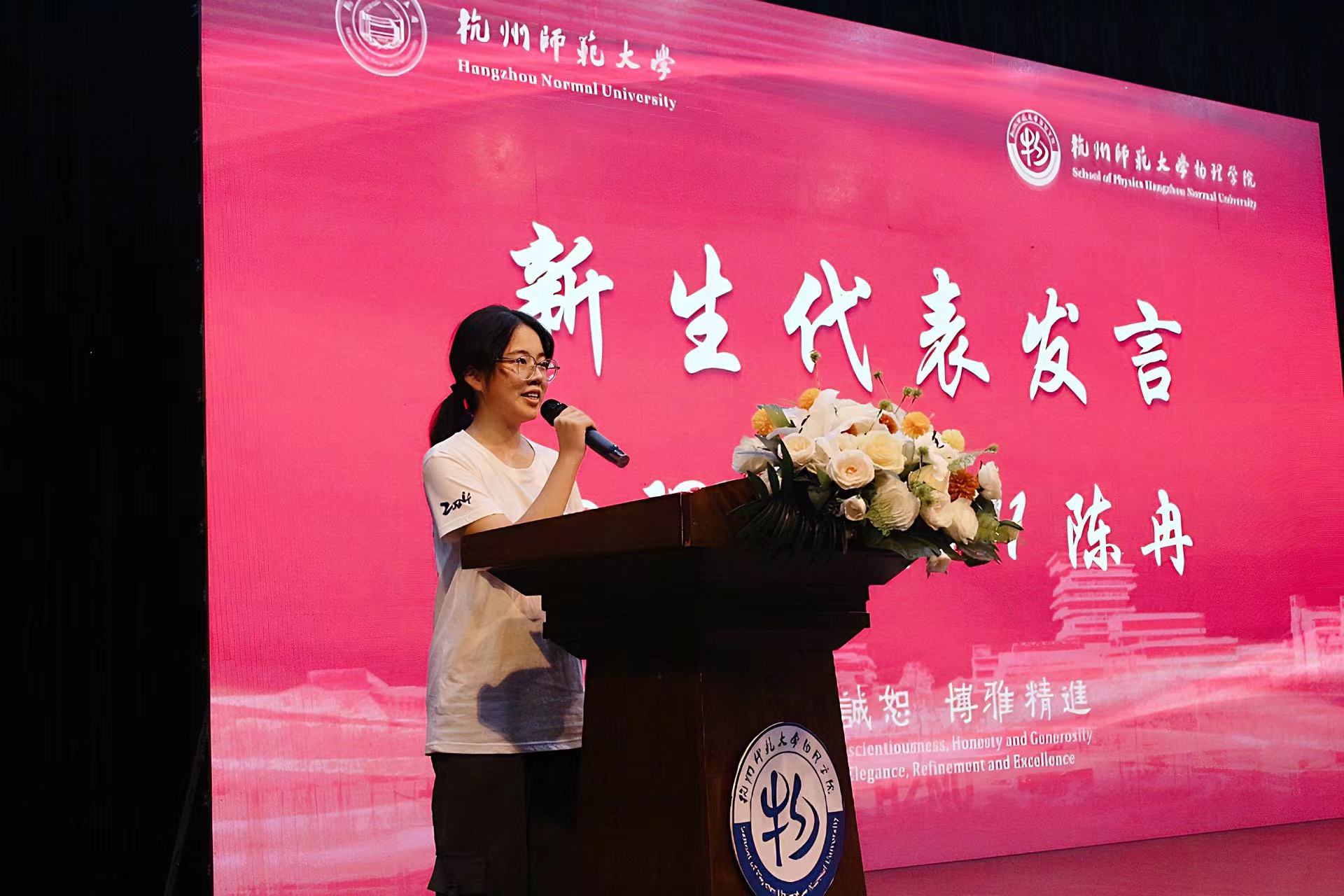 物理本硕241班陈冉同学作为新生代表,针对新生们面临的挑战和责任提出了应对之道,即信念、担当和奋斗。她呼吁新生们要团结互助,为学院和学校的发展贡献力量。