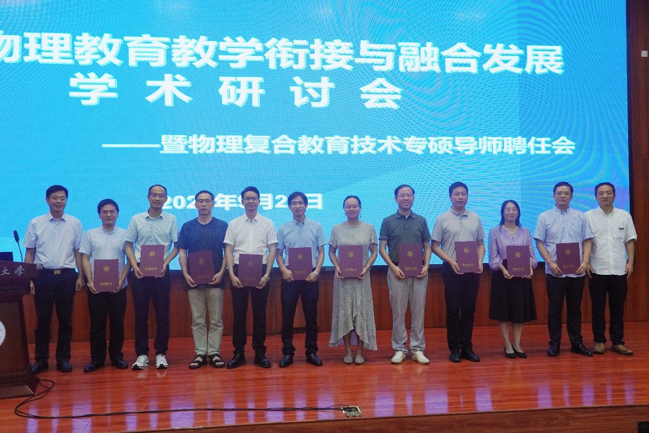 会上,成立了物理复合教育技术专硕导师团,院长侯红生、党委书记何军为受聘担任教育硕士导师的12位教学名师颁发聘书。随后,导师们分组与现场师生进行了深入的交流与讨论,激发了大家对于物理教育未来发展的无限遐想与探索热情。