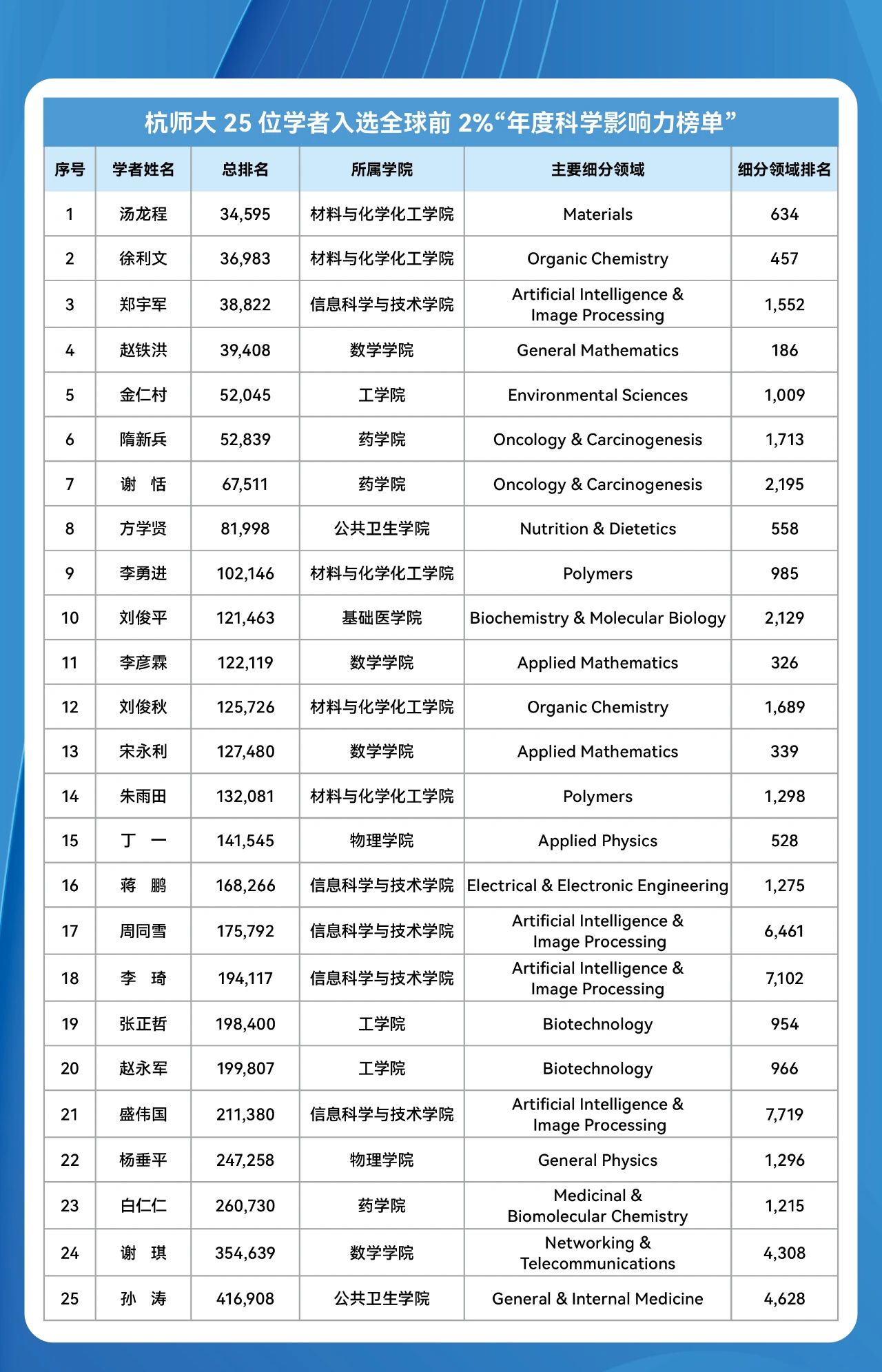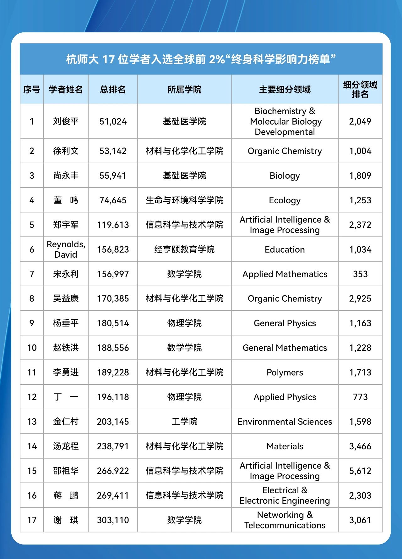 2024年9月16日,美国斯坦福大学和爱思唯尔数据库发布2024全球前2%顶尖科学家榜单(World's Top 2% Scientists),榜单共分为“终身科学影响力榜单”(关注整个学术生涯迄今的影响力)和“年度科学影响力榜单”(聚焦本年度的学术成就)。如意直播 共有30名学者上榜,其中,如意直播 有杨垂平教授、丁一教授2位学者分别入围“终身科学影响力榜单”、“年度科学影响力榜单”,见下表。