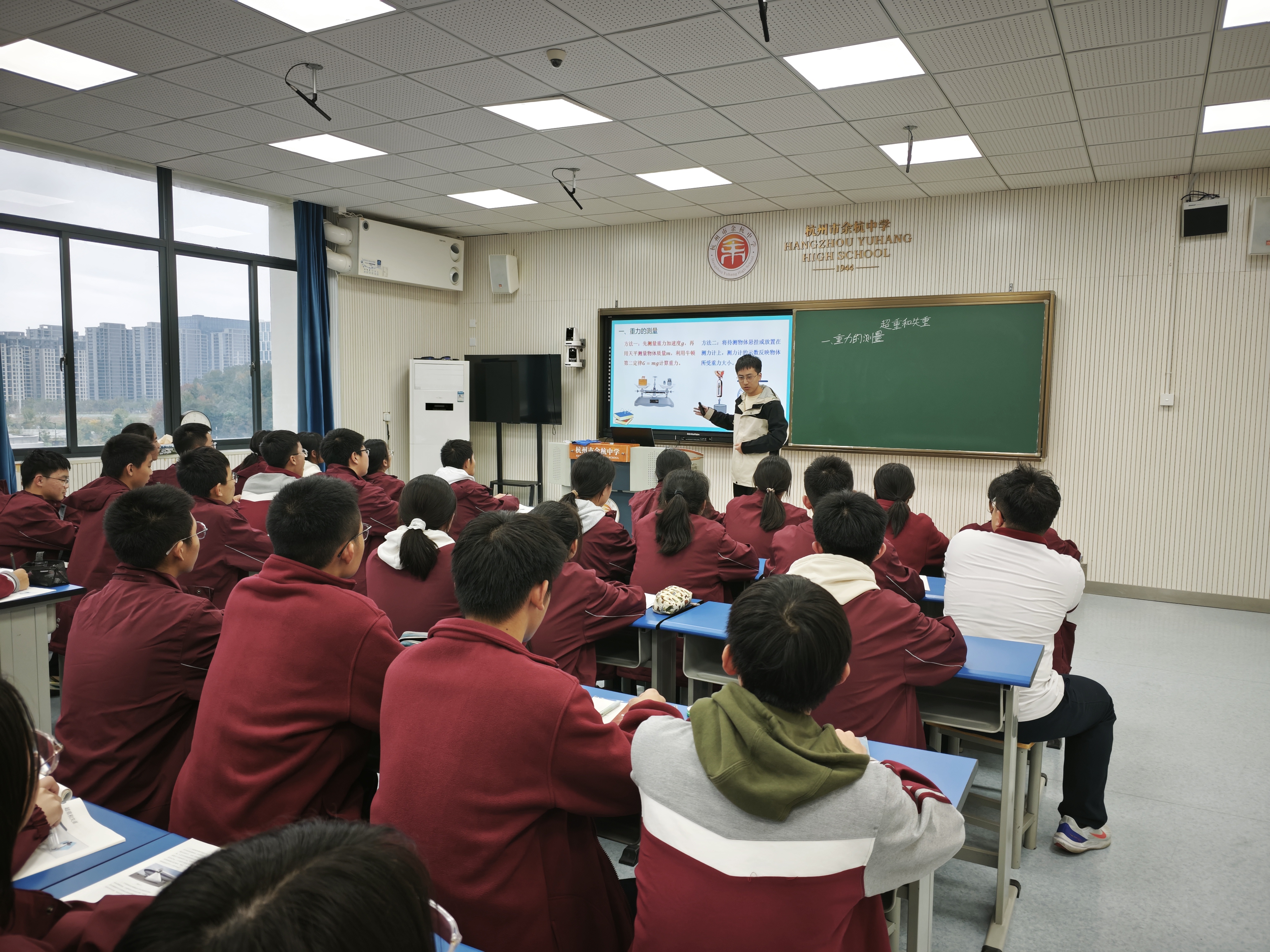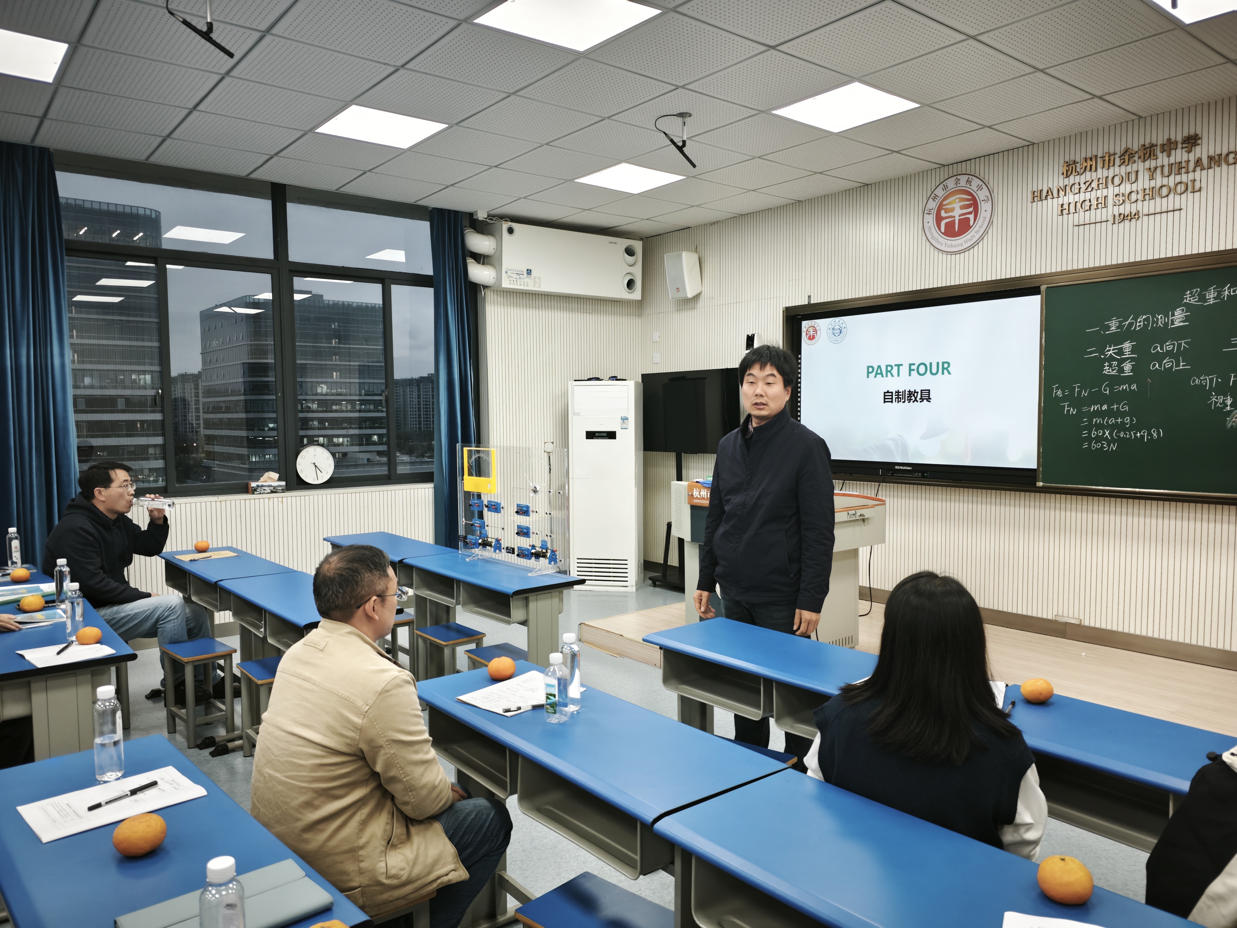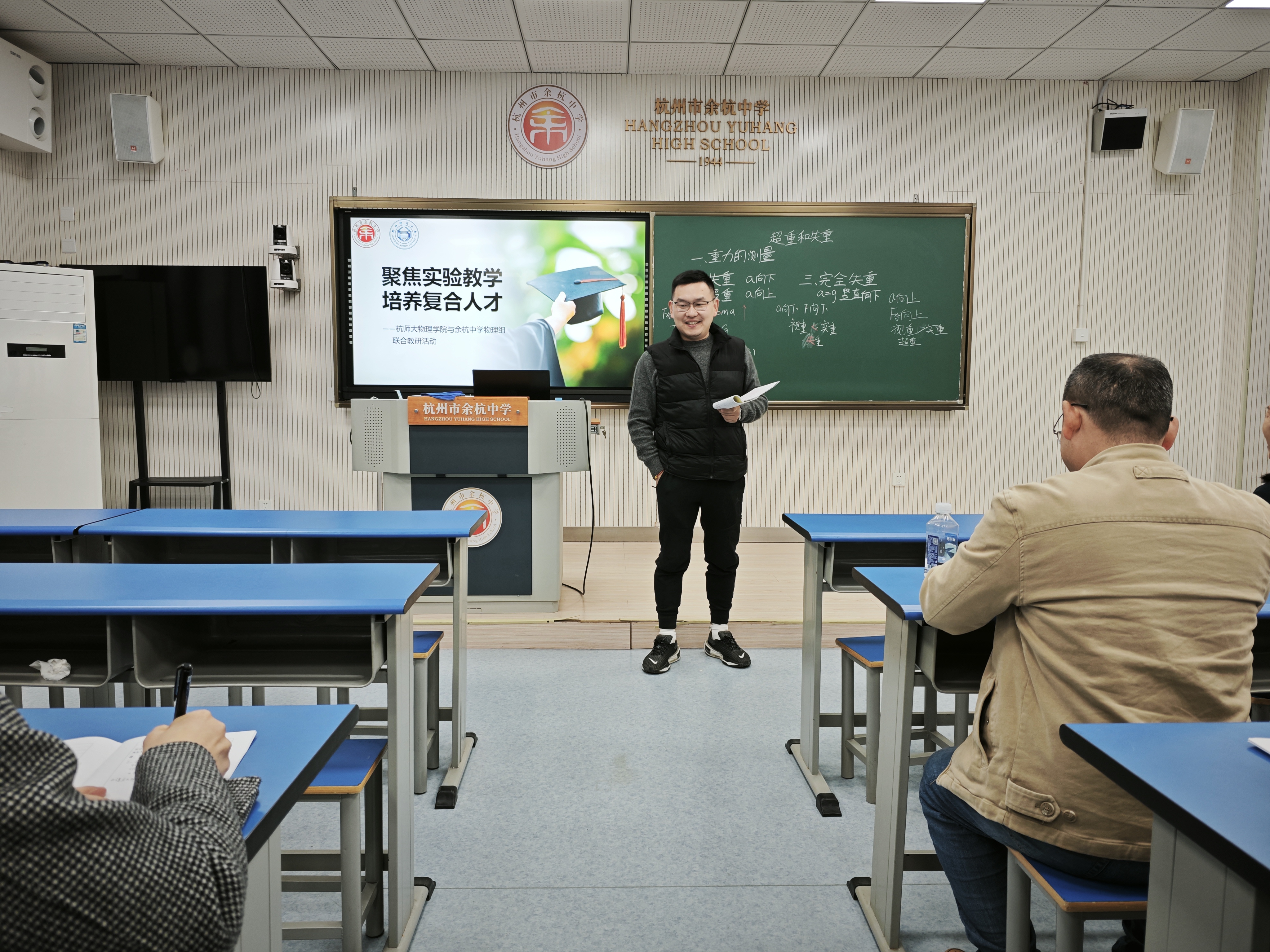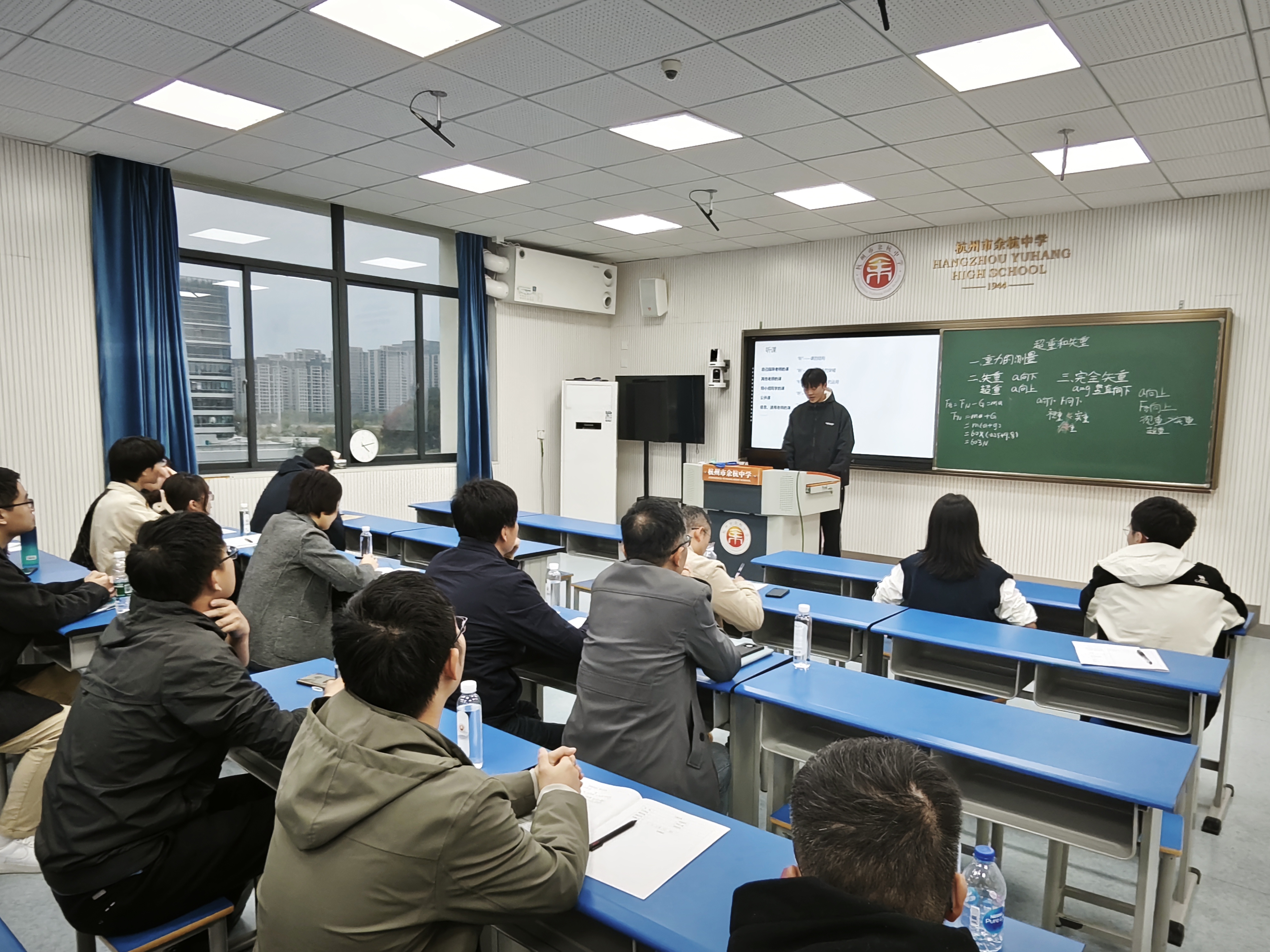 本次活动内容丰富,包括课堂展示、评课交流、专题汇报和自制教具展示等环节。物理本硕211班实习教师丁浩聪带来了一堂《超重和失重》的展示课,通过体重计称量体重的情境,引导学生构建模型,并利用力传感器定量研究物体在竖直方向上的不同运动状态,加深了学生对超重和失重现象的理解。