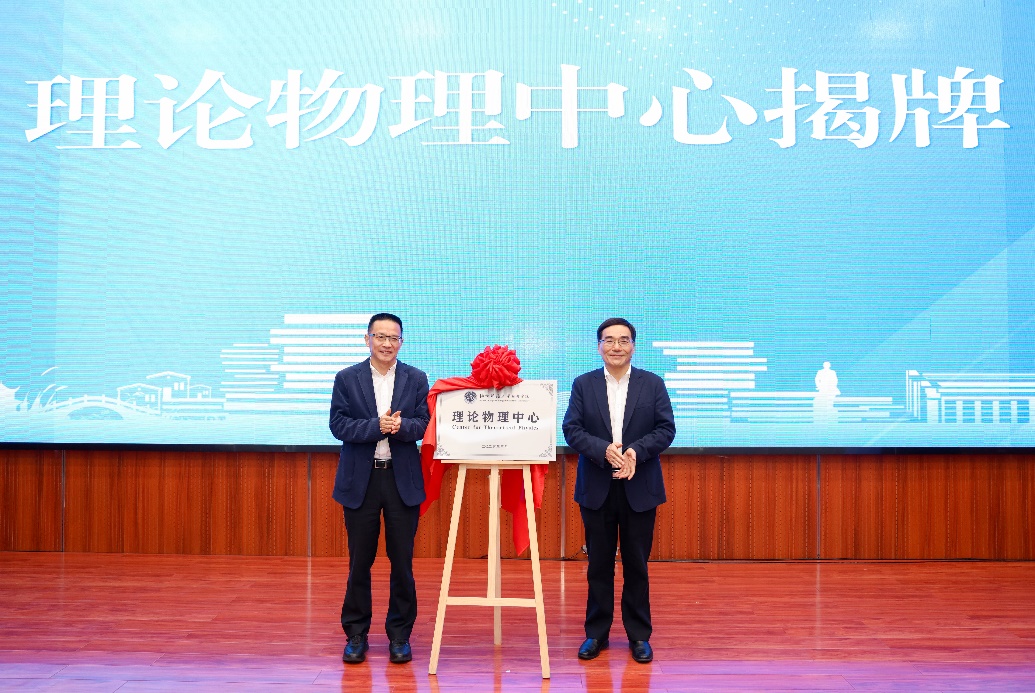 校党委书记郭东风,中国科学院院士、宁波大学校长蔡荣根(我校1985届校友)共同为中心揭牌。蔡荣根院士受聘担任理论物理中心学术委员会主任。校党委副书记杨政致辞。湖州师范学院副校长李庆峰教授以及来自国内30多所高校的50余位理论物理学界的专家学者出席活动。